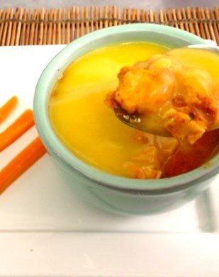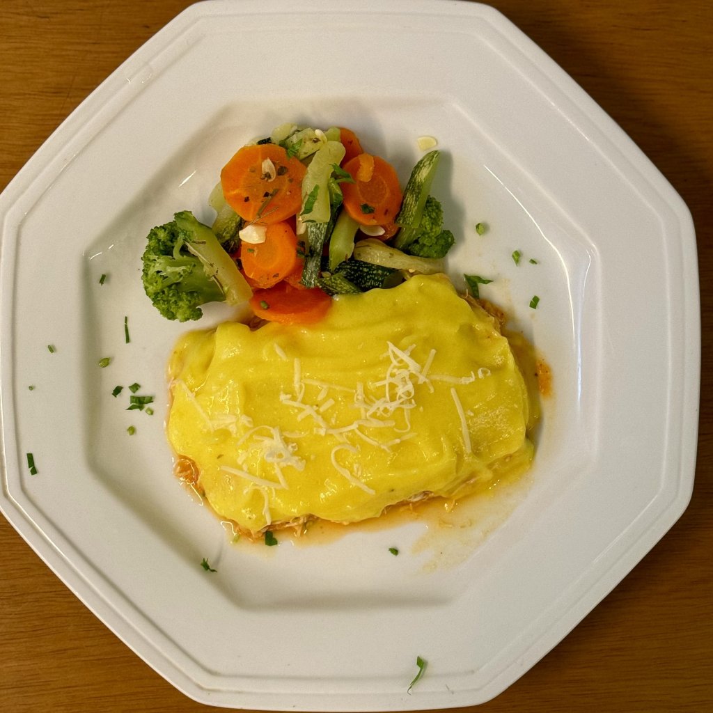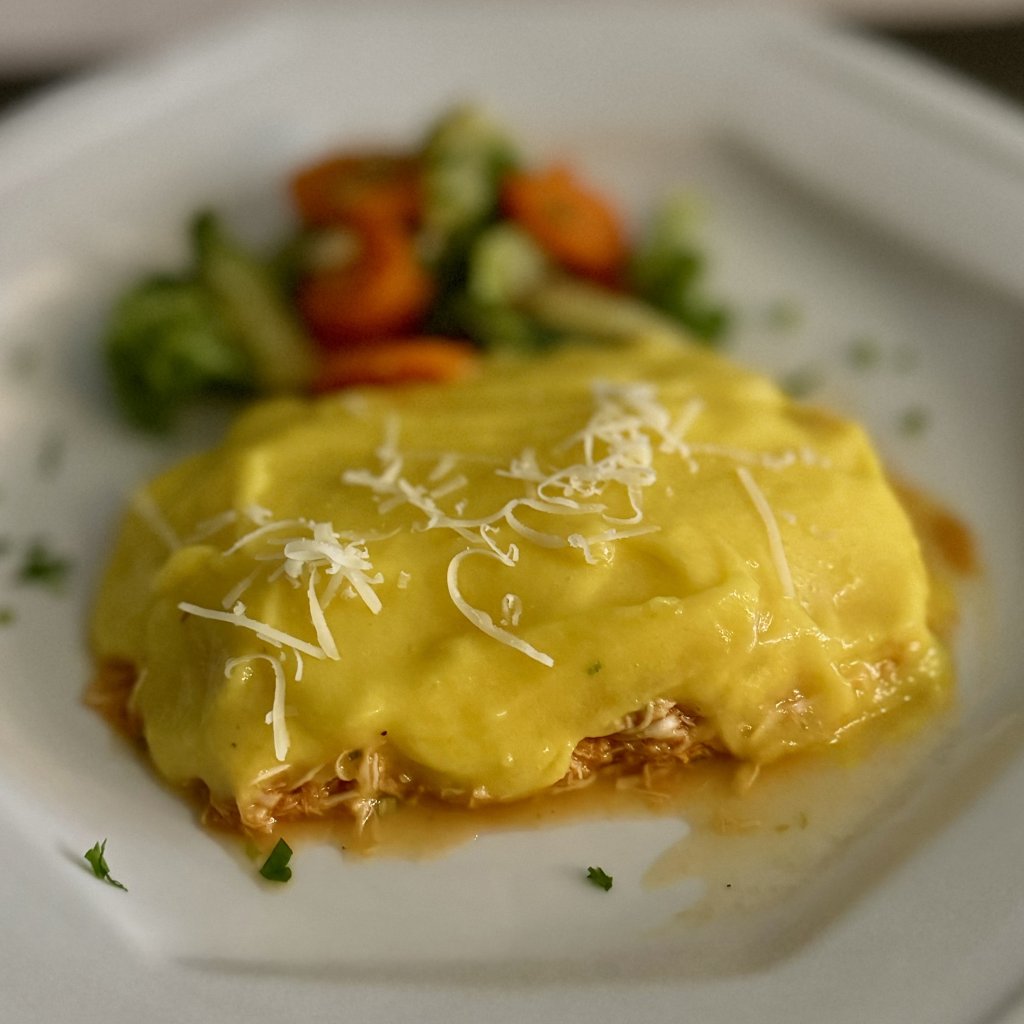 Filé de peito de frango em cubos, em delicioso tempero, coberto por fino creme de batata baroa