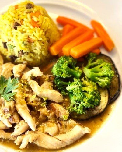 Filé de peito de frango grelhado em tiras, coberto por leve molho cítrico de laranja e gengibre. Acompanha arroz marroquino: açafrão, cubinhos de berinjela, cenoura e abobrinha.