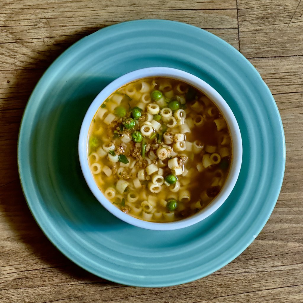 Saborosa sopa com massinha tipo argolinha, carne moída magra, ervilha e tempero verde