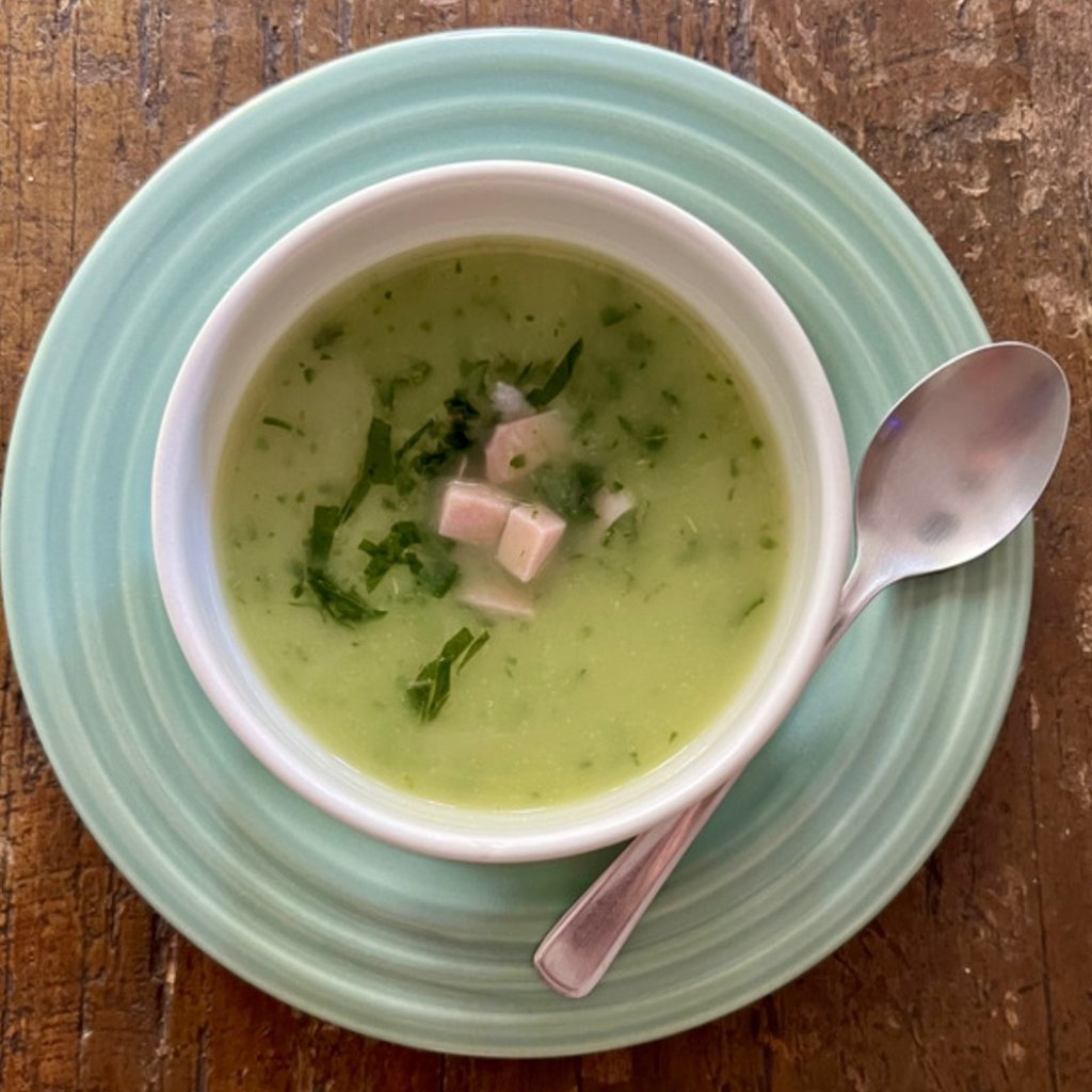 Caldo cremoso de batata inglesa, com cubinhos de chester defumado e couve fininha