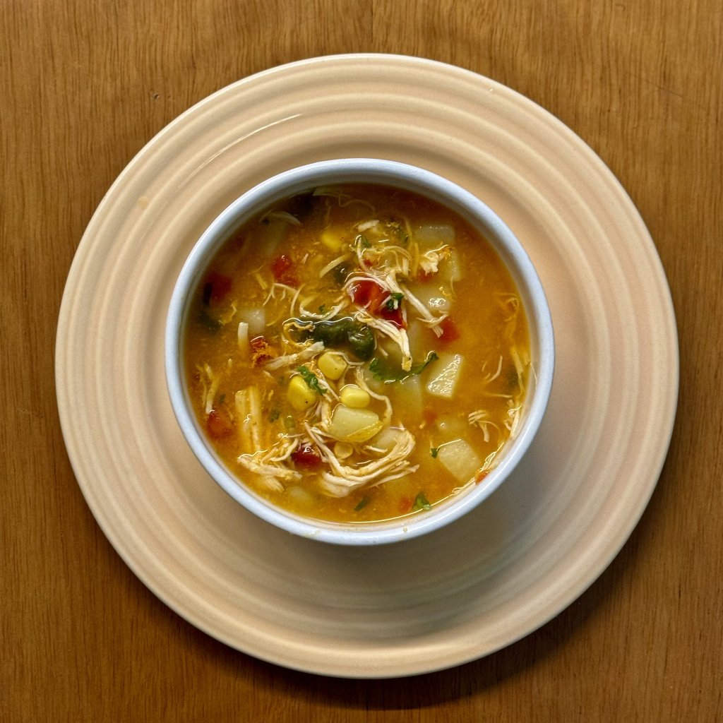 Sopa com pedacinhos de vagem, tomate e batata, acrescida de milho e peito de frango em delicioso tempero